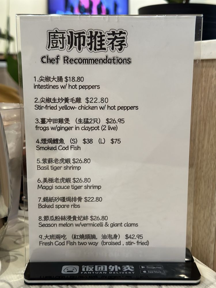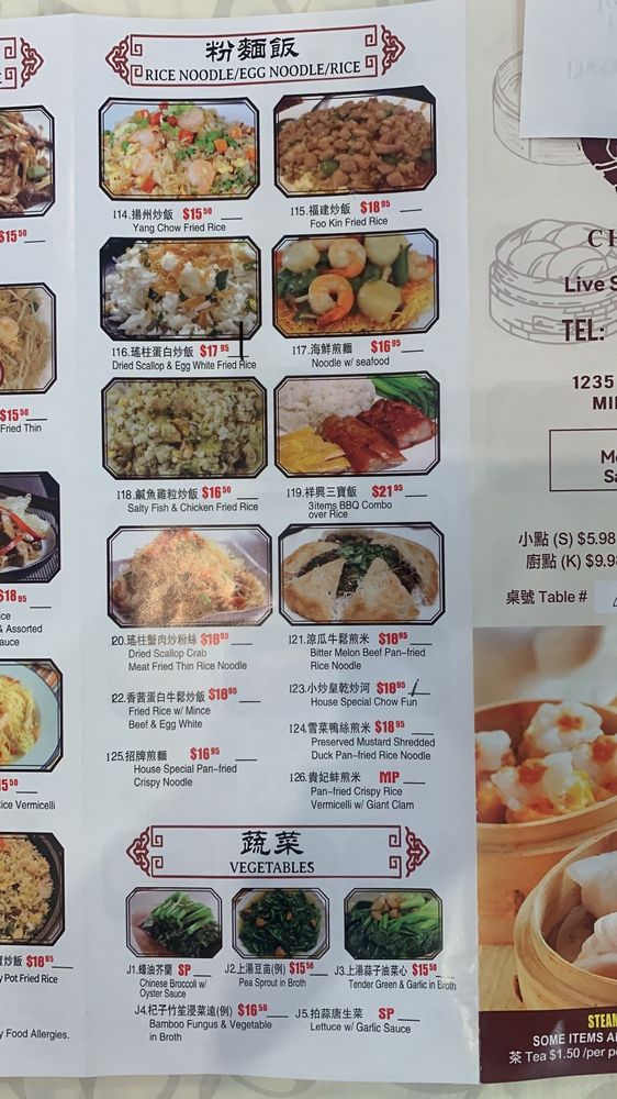With tofu soup peking spareribs marinated steam chicken lobster with ginger and green onion mustard green with broth clams with black beans sauce steamed live fish young zhou fried rice, dessert.